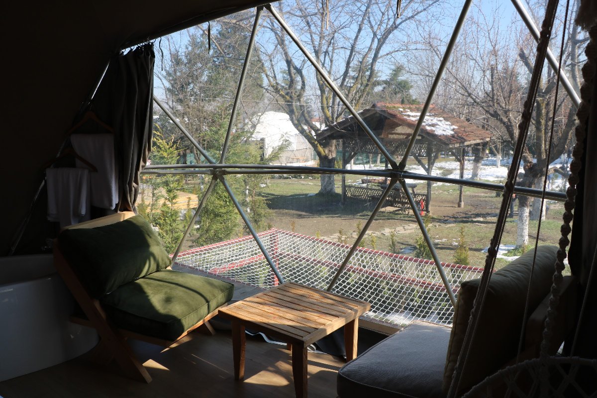 Sapancada yaşayan iki yatırımcı, daha önce yurt dışında gördükleri ve deneyimledikleri dome glamping çadırlarını Sapanca’da kurdu. Sapanca’nın doğal güzellikleriyle birleşen glamping çadırları doğaya zarar vermeden bir tatil imkanı sağlıyor.